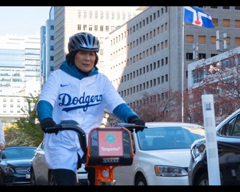 Olivia Chow was spotted in Toronto on Tuesday riding her bike in a blue-and white Dodgers jersey. The sight came just a few days after the Blue Jays were defeated in Game 7 of the 2025 World Series, as the Dodgers won the championship for the second year in a row.